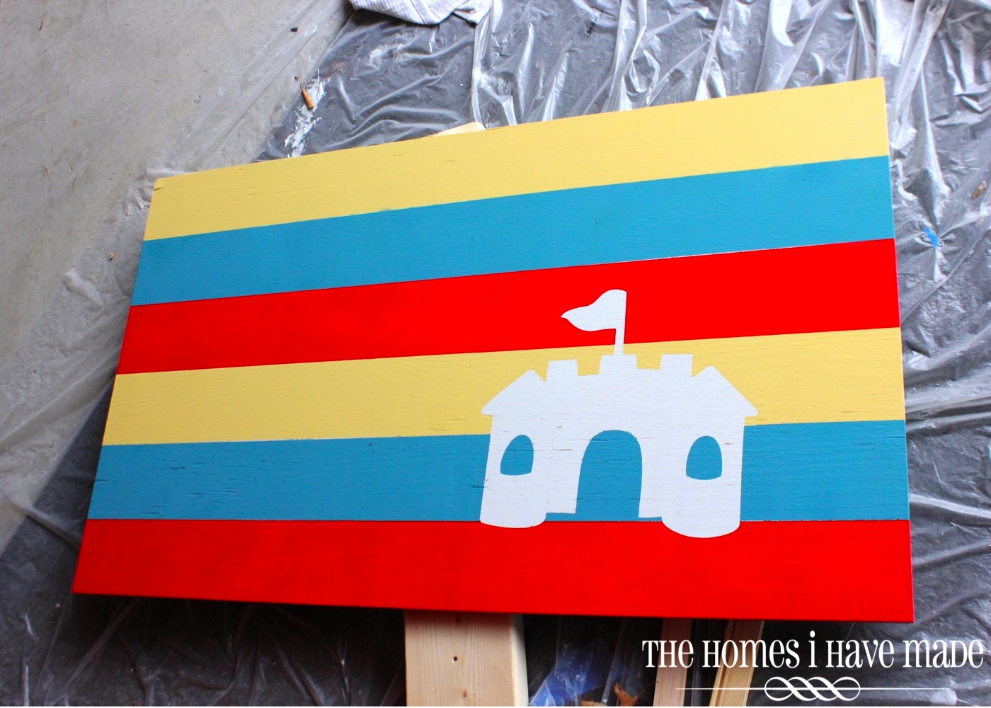 - I then cut out a sandcastle graphic from plain contact paper using my Cricut (image from the Doodlecharms cartridge) and applied it to the lower right corner of the plywood.