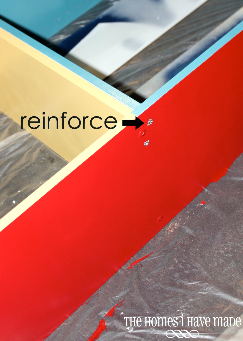 Because we were not going to use this for the intended purpose (as a bookcase) and it was going to be holding 200 pounds of sand, we reinforced all the junctions with extra screws. We also screwed the second shelf (the blue one) up against the yellow shelf. This completed my color-block pattern all the way around the compartments.