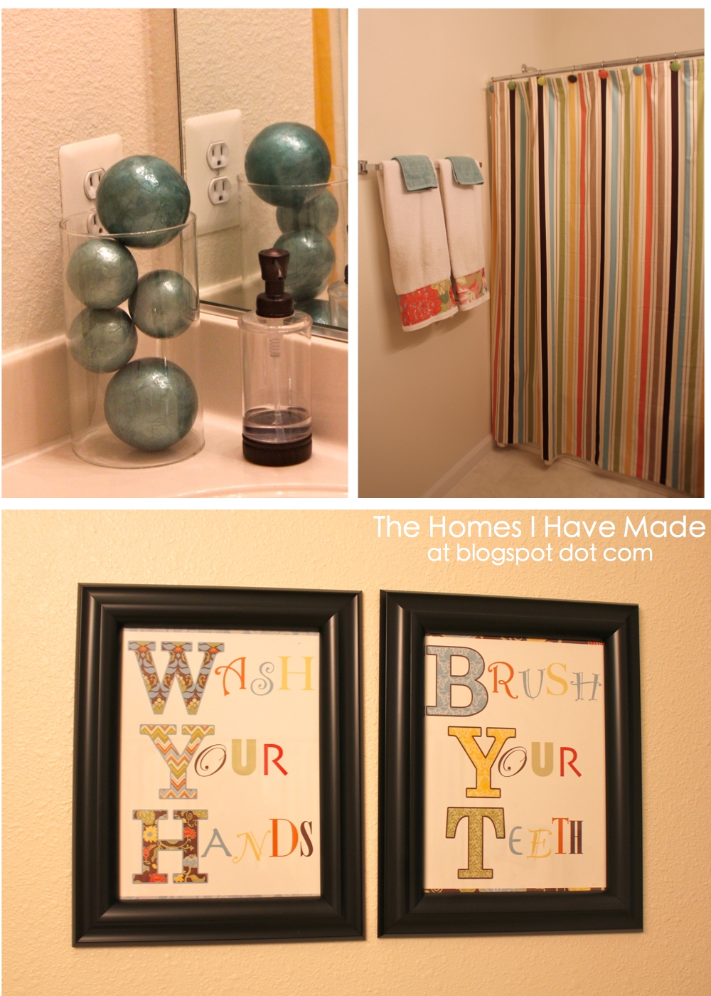 I already had the fabric adorned white towels (bottom right) from our last apartment. I then found the striped shower curtain (with all the same matching colors as my towels!) at Target!
