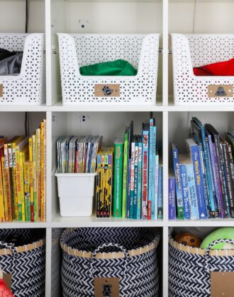 In a traditional bookcase, there are sturdy sides that help hold up books and other precarious items. Since these shelves don’t have sides, you may need to consider adding bookends, baskets, or solid decorative accessories to hold up books (this obviously isn’t necessary if you’re storing dishes or other large items.)