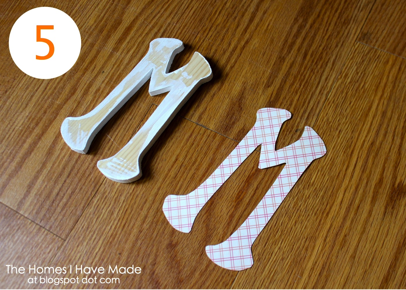 4. Create the wooden monogram. Repeat the paint/trace process with the small wooden letter. I painted the edges of my letter “M” with white craft paint, and then traced the letter onto coordinating scrapbook paper. You could certainly use fabric here as well, but I really liked the differences in texture. (However, I do think a tone-on-tone approach would look really neat too!). Wait…don’t adhere your decorative covering to your letter just yet!