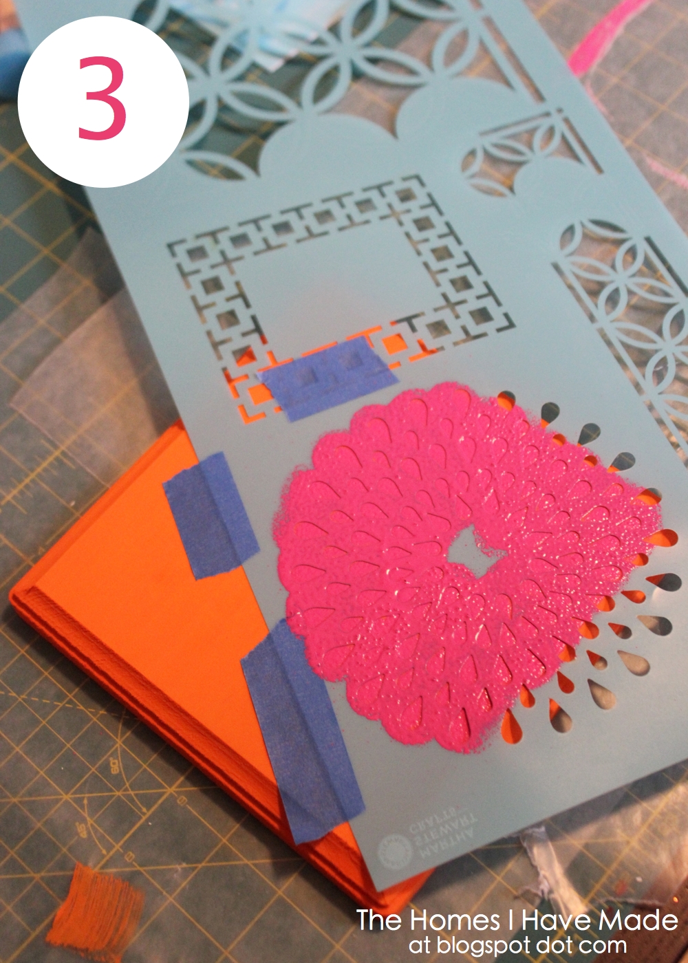 3. Stencil your plaque with paint. (You could possibly skip this step, but I wasn’t sure how well the glitter alone would cover my orange paint…to be sure your design shows up nice and bold, do a quick stencil with paint first!). Choose a stencil (I used one of Martha Stewart’s), secure it with painter’s tape, and lightly dab on a contrasting color paint. Move the stencil around until you get the patten you desire.