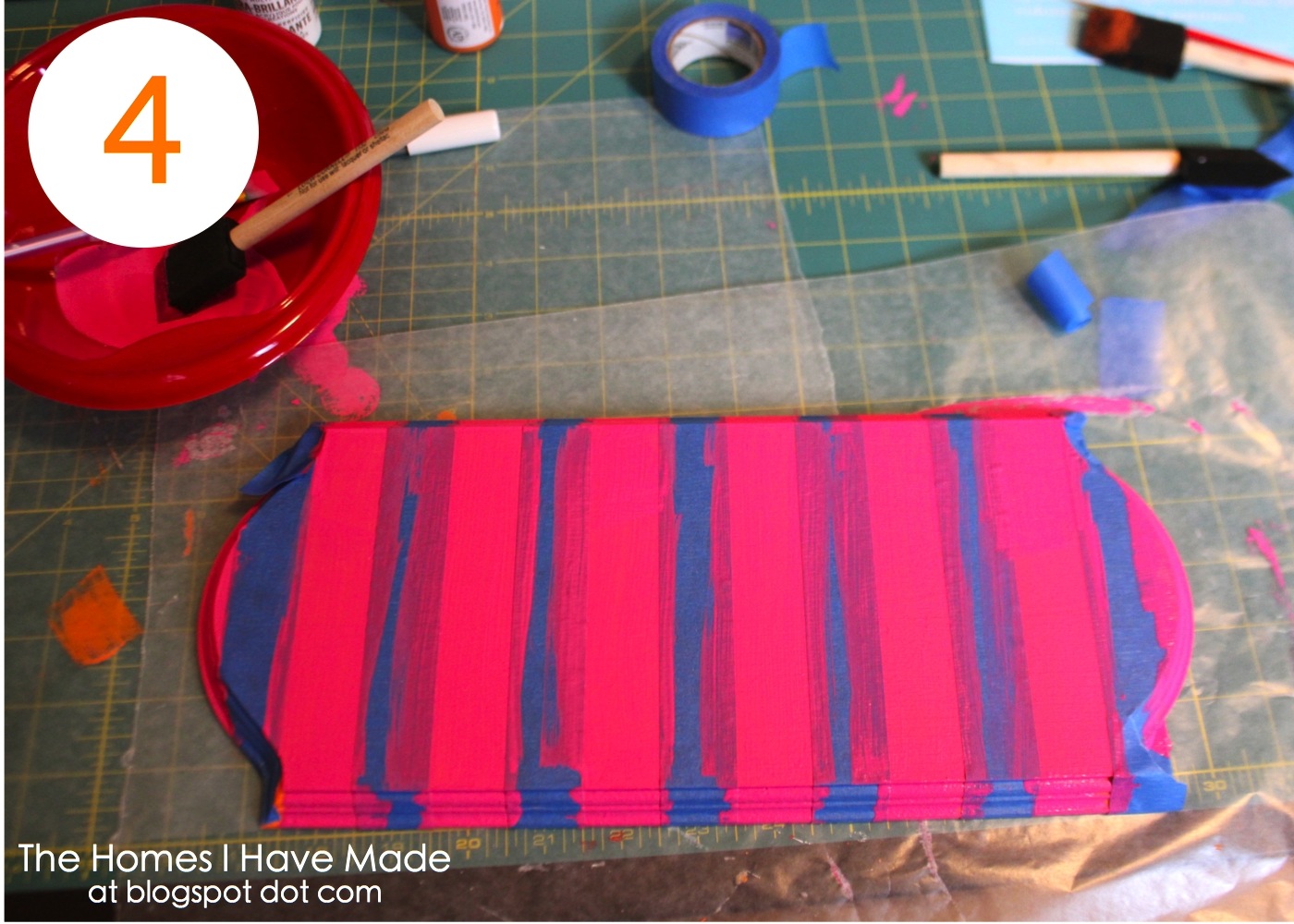 3. Apply tape. Apply strips of painter’s tape to create your stripes. You can make these any distance apart you like…but to avoid measuring (I’m lazy that way), I simply used the width of my tape as the width of my stripes (I had an extra length of tape that I put down to “measure” between each stripe and removed it as I went…does that make sense?). Really press down and make sure your tape is secured to the plaque (including all the groves down the edges).
