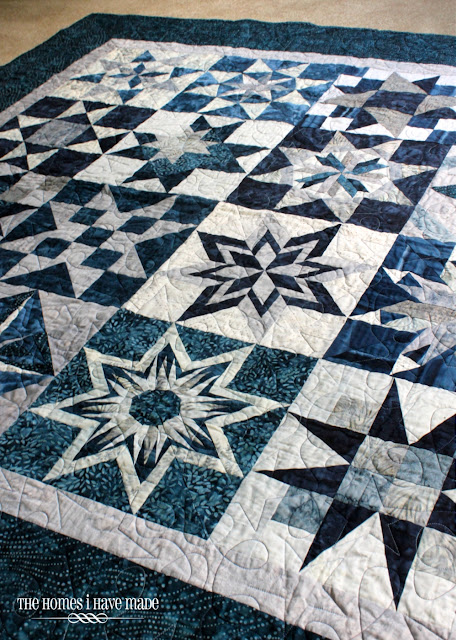 I’ve already given you some sneak peaks of the most recent quilt my Mom made for me, but I’ve been trying to hold back so I could show it to you today in all its glory. My Mom just made this blue/white/grey star quilt for our family to match our new blue couch and new room color-scheme.