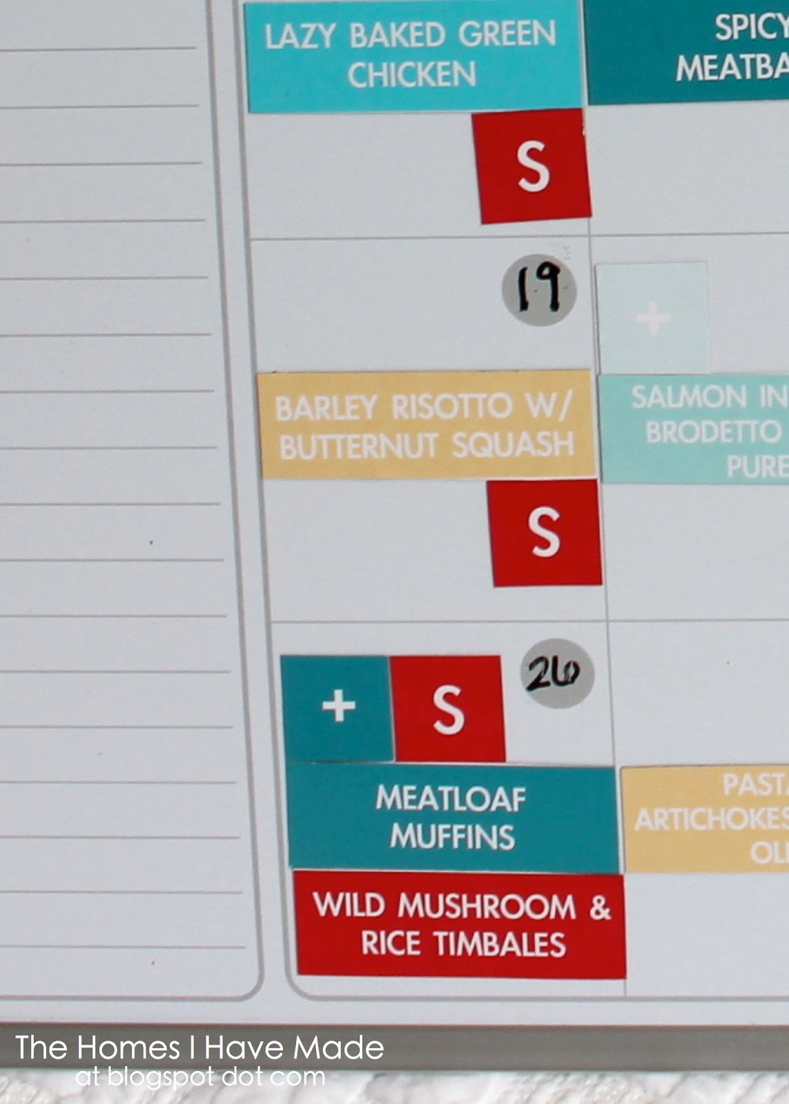 Are you still following me? In the picture above…on February 19th, we will be having Barley Risotto with Salad (S) and on February 26th, we’ll be having Meatloaf Muffins with both Wild Rice Timbales and Salad (S)! Just like with the color-coded protein labels, these red labels allow me to quickly assess if we are getting too much of one thing and not enough of another!
