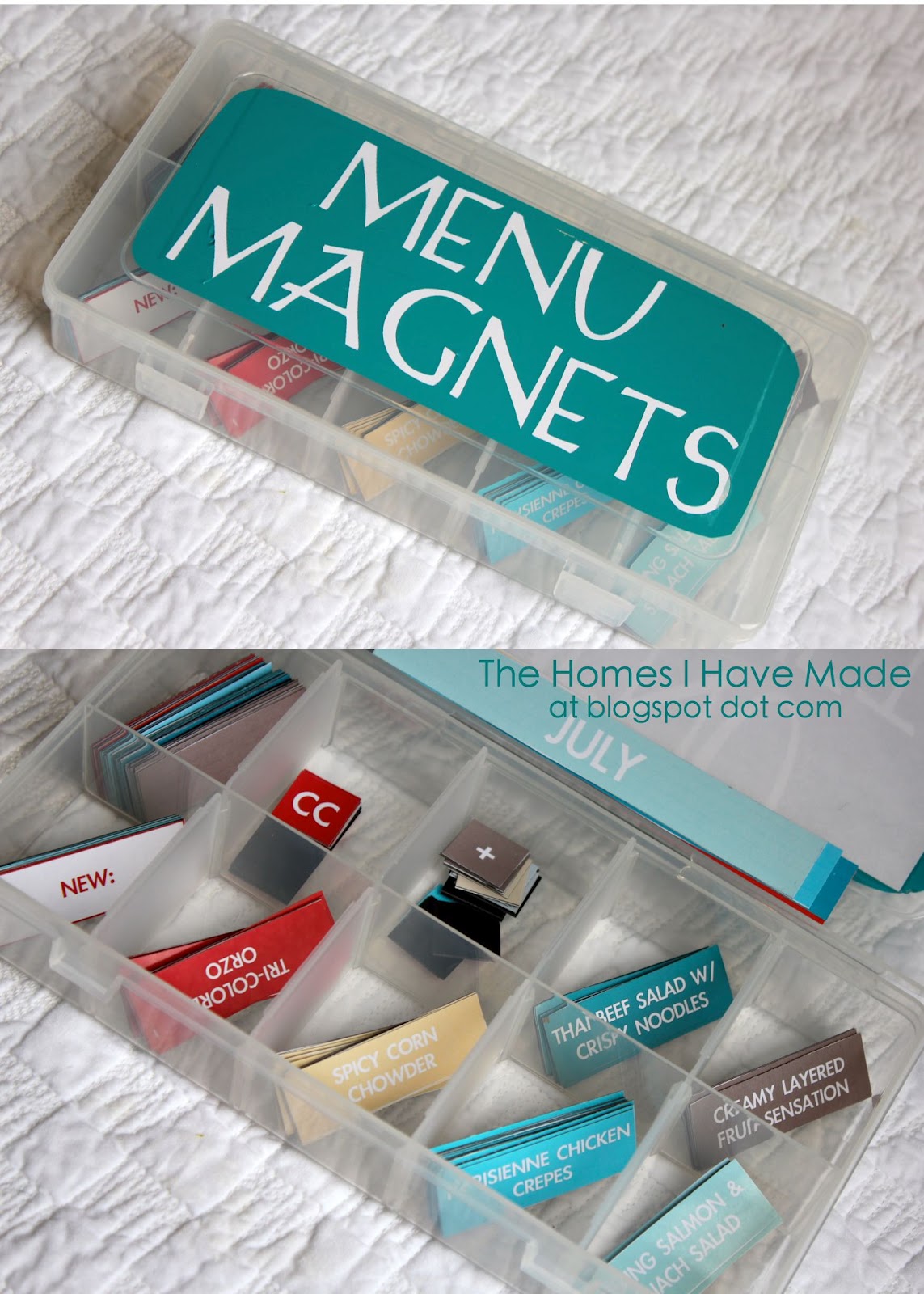 To organize and store all my magnets when they are not in use (because I have a lot more than 31 recipes!), I bought a simple craft box that can tuck in behind the menu board!
