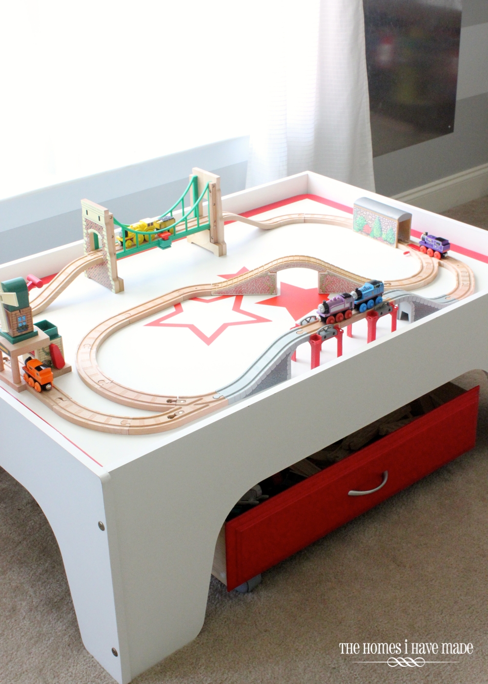 Megan, what a great way to reuse the drawer. Glad to know I am not the only one with stuff I have accumulated over the years. lol The pop of red on the drawer face looks amazing with the train table. 🙂