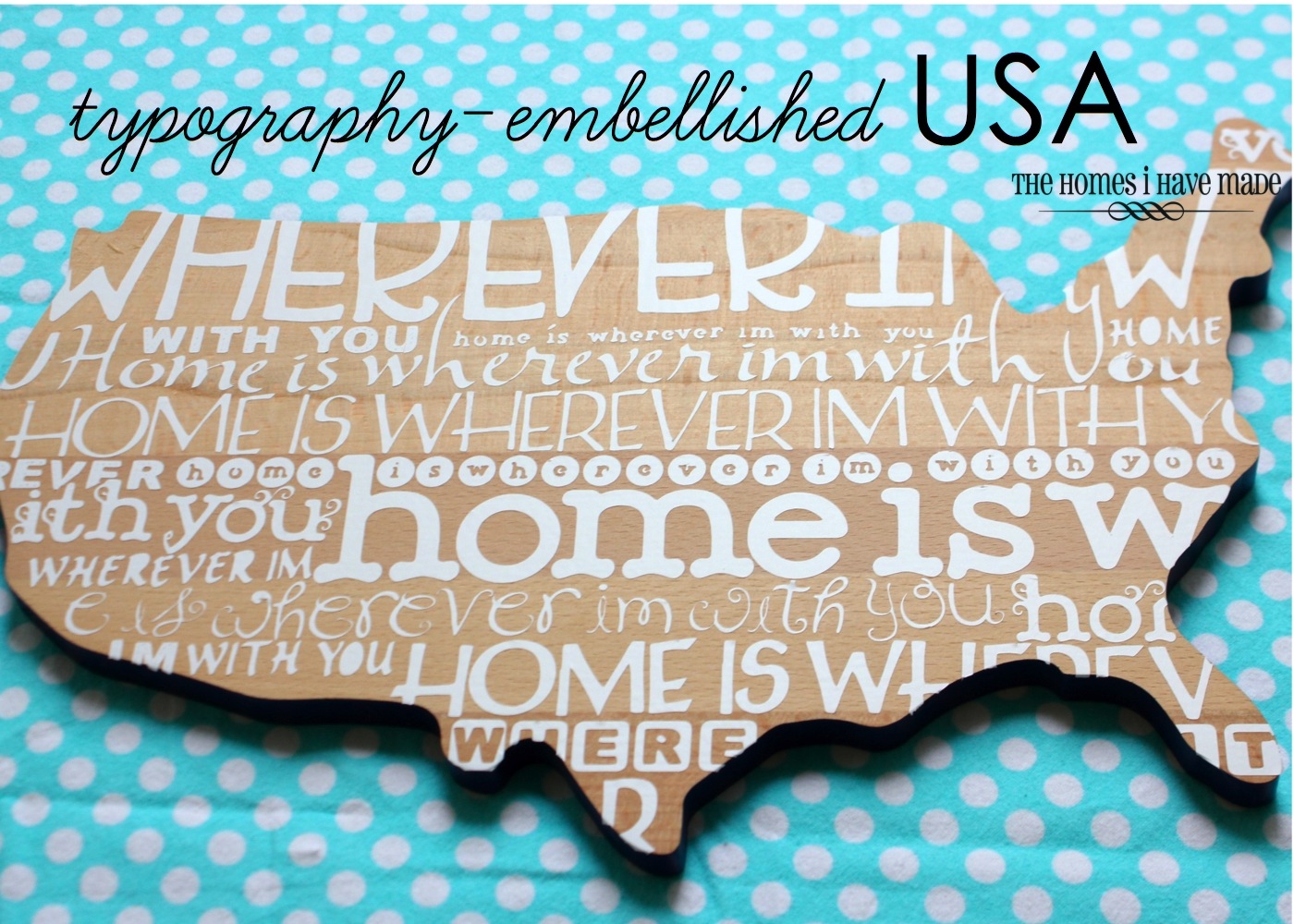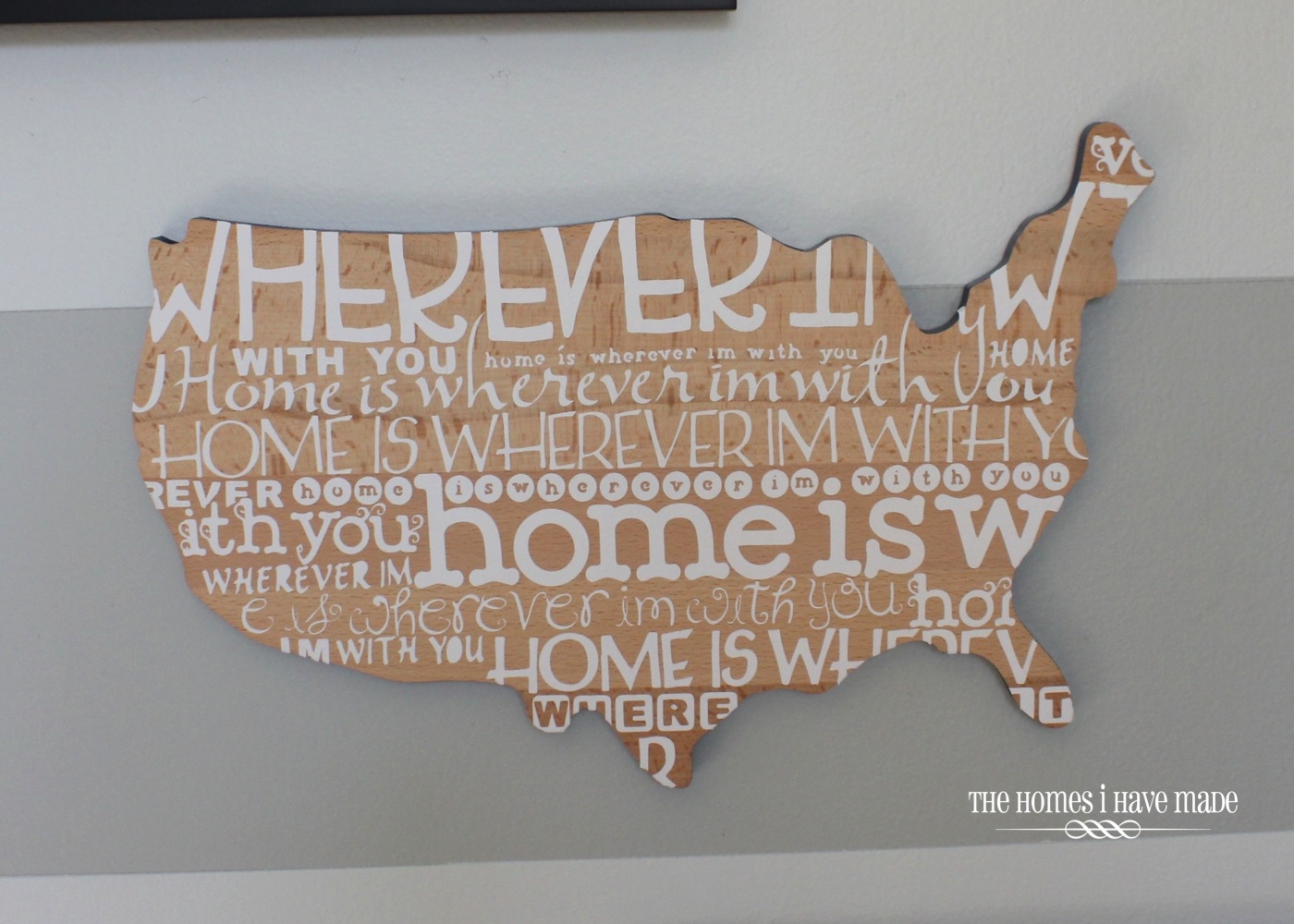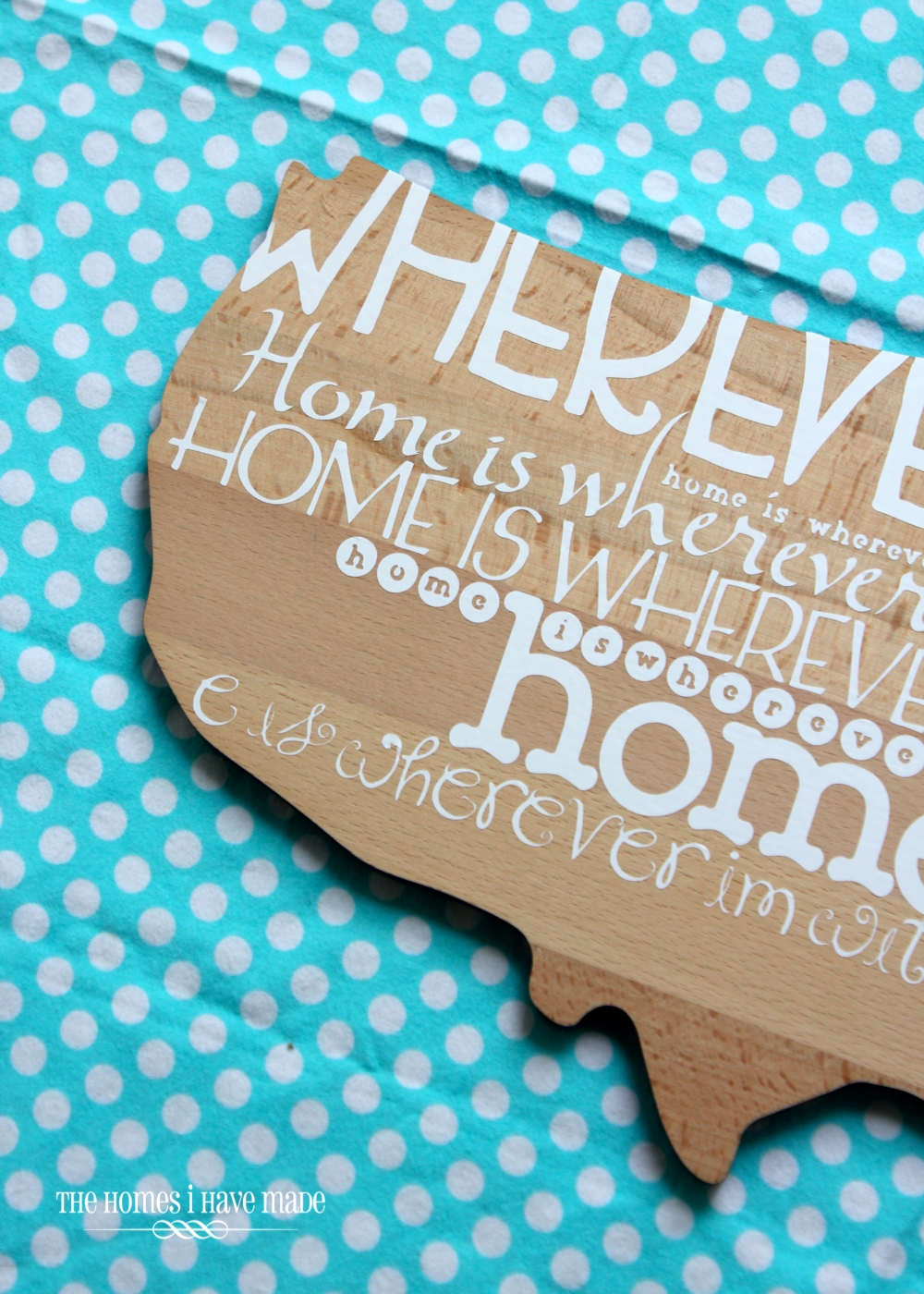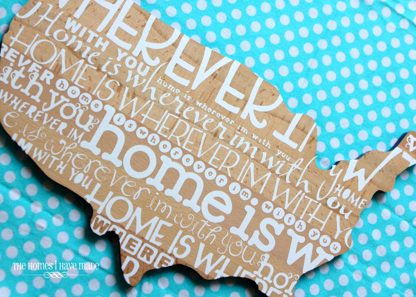 I loved the sentiment so much – “Home is wherever I’m with you.” – it’s perfect for our very transient family without being overly sappy. To capture the same effect on the wooden USA, I cut out the phrase from vinyl in every cricut font I had, and varied the font size based on what space I was trying to fill up.