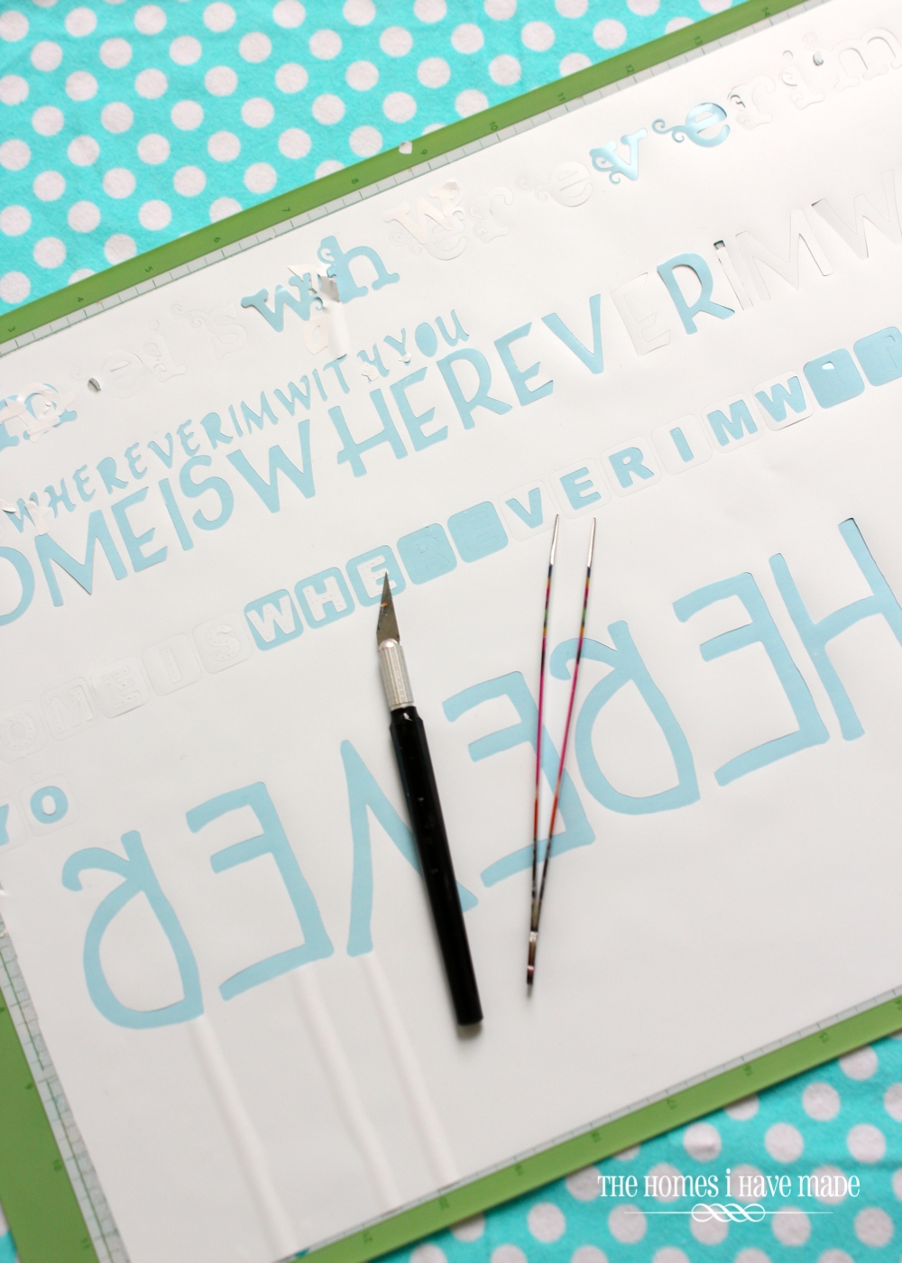 I cut and applied as I went. I started with some bigger stretches of the phrase and then filled in the holes with smaller fonts. I went back and forth cutting and apply, using an exacto knife (to pry the letters from the vinyl) and a tweezers to place the (especially small) letters.